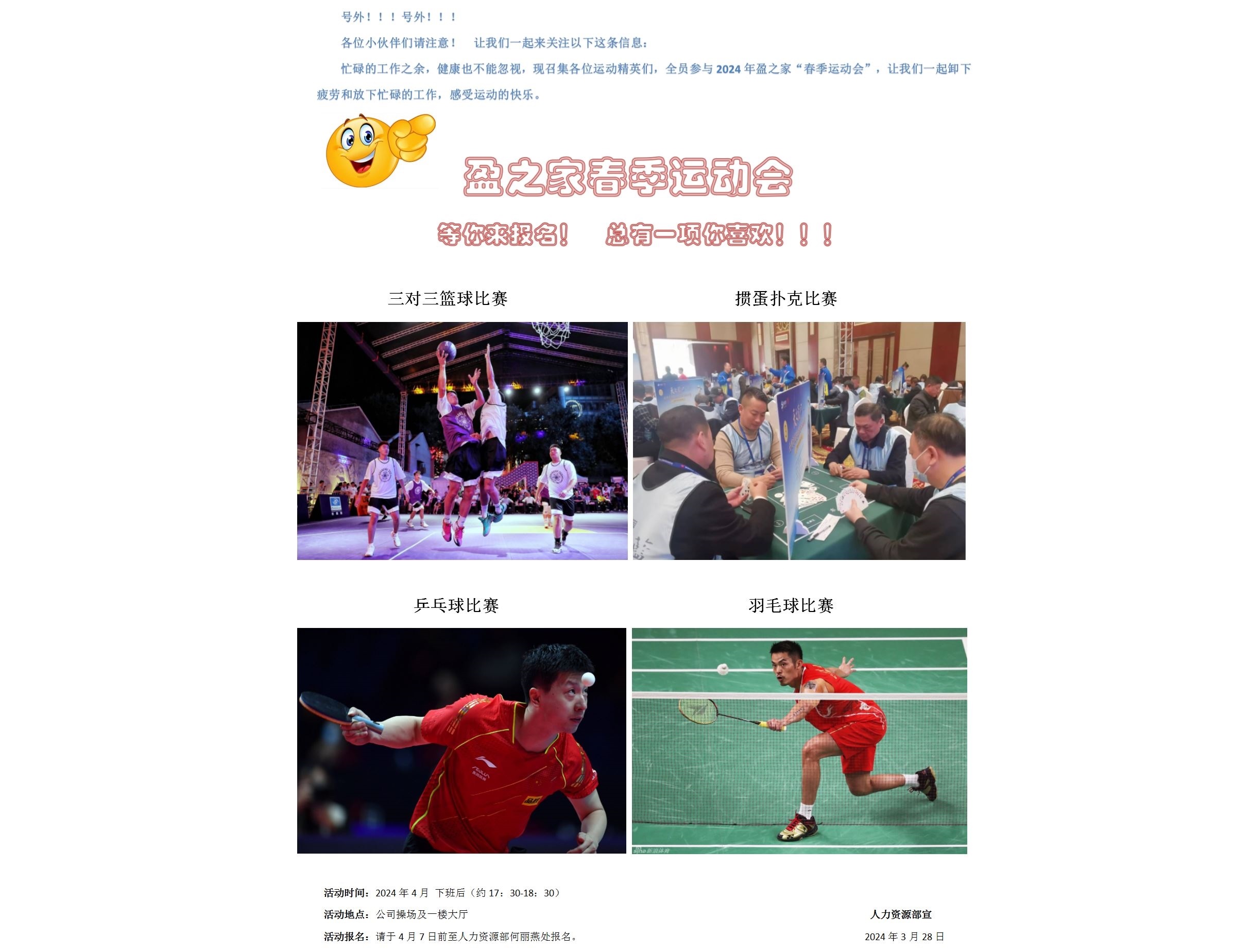 忙碌的工作之余,健康也不能忽視,現(xiàn)召集各位運(yùn)動精英們,全員參與 2024 年盈之家“春季運(yùn)動會”,讓我們一起卸下疲勞和放下忙碌的工作,感受運(yùn)動的快樂。